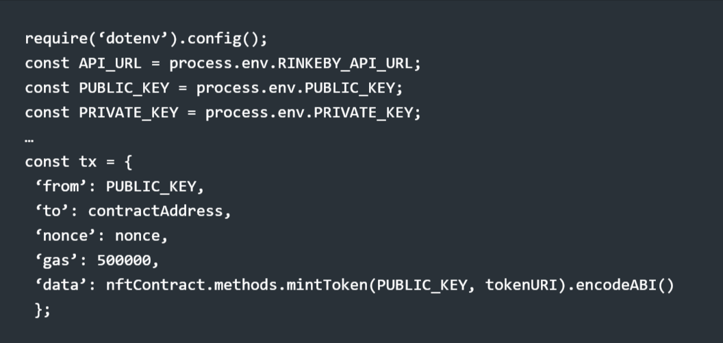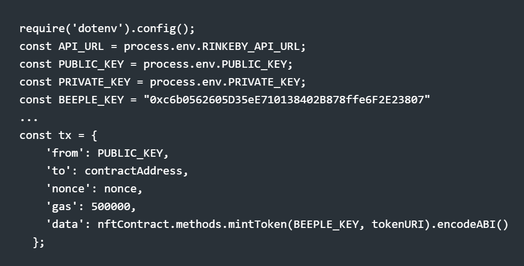 Observe that the nftContract.methods.mintToken function in the second code block uses BEEPLE_KEY instead of your own PUBLIC_KEY.